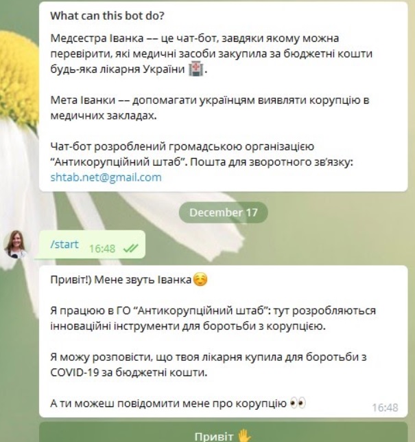 Бот «Медсестра Іванка» від громадської організації «Антикорупційний штаб» дозволяє автоматично отримати інформацію про те, скільки та на що українські лікарні витрачають грошей.