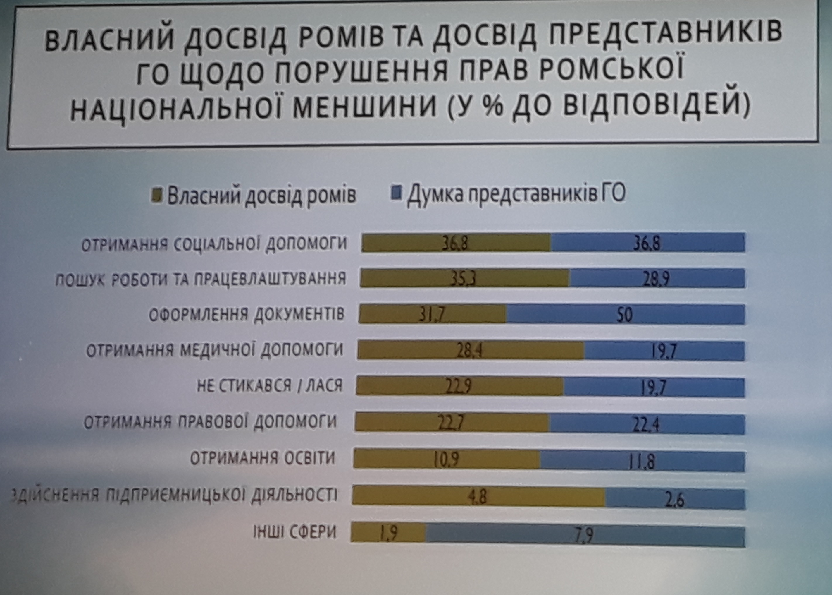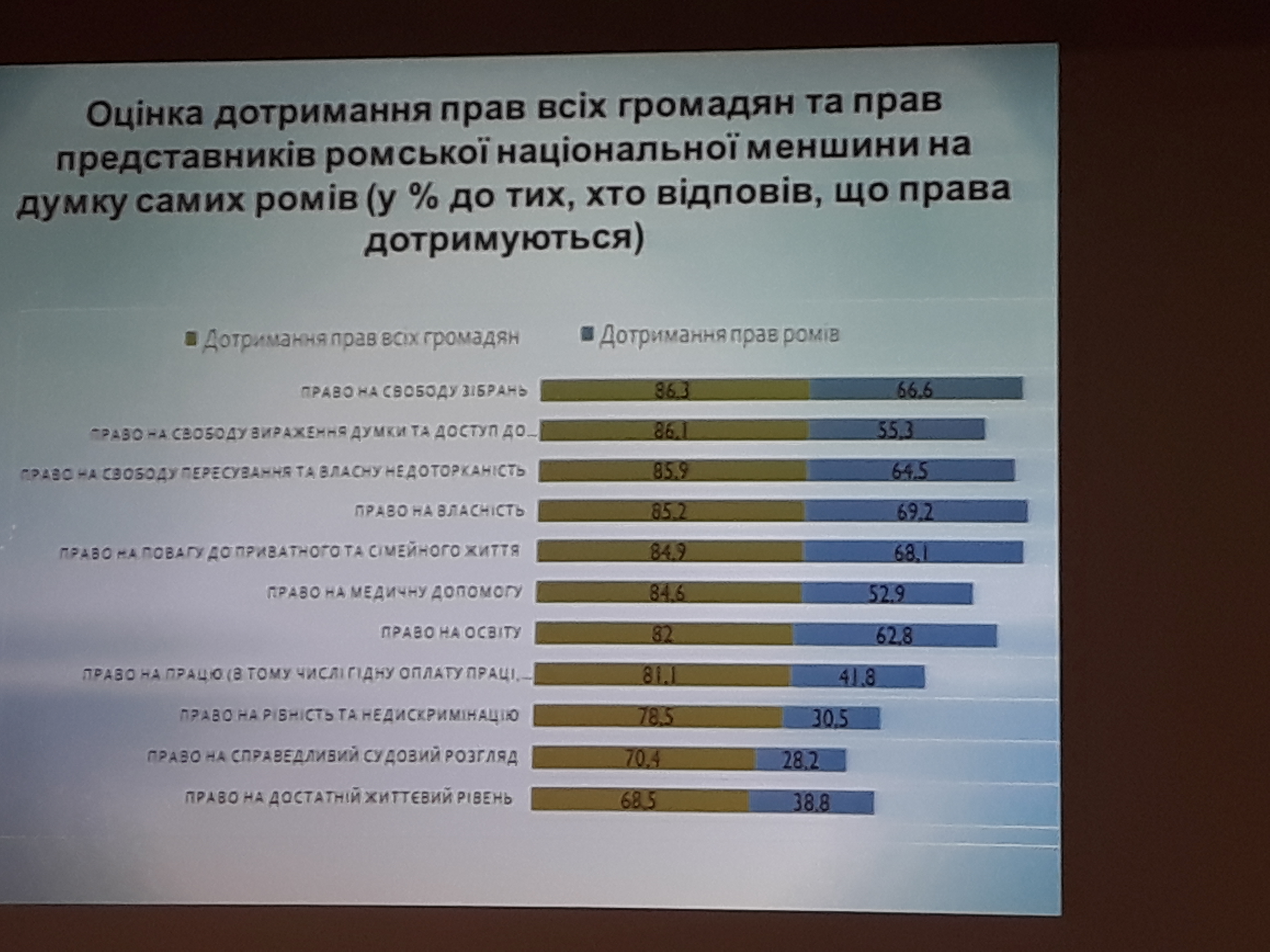 З результатами соціологічного опитування ромів присутніх ознайомив президент Ромського правозахисного центру з Одеси Володимир Кондур. За його словами, довіри до влади серед ромської громади дуже мало, а справедливості у судах та інших державних інстанціях вдається добитися досить рідко, набагато рідше, ніж етнічним українцям. І понад 11% опитаних вважають, що у них нема жодних способів захистити свої права.