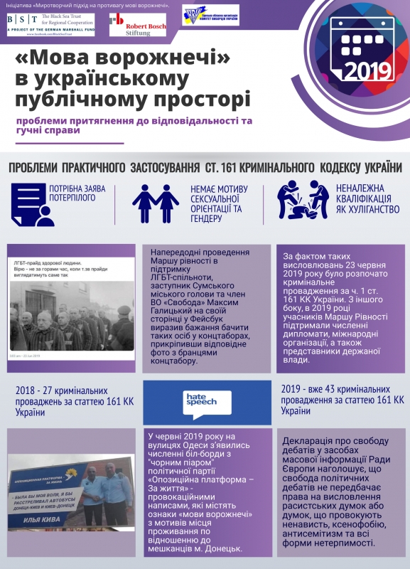 Станом на 2019 рік, в Україні обмежена можливість притягнення до відповідальності за використання або поширення «мови ворожнечі». Одним із найбільш розповсюджених засобів протидії «мові ворожнечі» залишається притягнення особи до кримінальної відповідальності за ст. 161 Кримінального кодексу України. В той же час, судова практика виявила декілька суттєвих проблем щодо практичного застосування цієї статті: