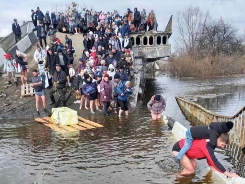 Зрештою ми прийшли до підірваного мосту через річку Ірпінь. Там можна було йти тоненькою балкою, що лишилася від мосту, частково можна було триматися руками за рештки, а місцями – взагалі не було за що. Треба було йти по пояс у крижаній воді, намацуючи ногами балку і балансуючи. Багато хто падав у воду і потім плив, як міг. І старі люди, і немічні… З іншого боку представники «Червоного Хреста» зробили невеличкий пліт з дерева і пінопласту і перетягували на ньому жінок з маленькими дітьми, але він іноді перевертався. У багатьох людей від холоду були судоми. А навколо стріляли, були вибухи, люди панікували, поспішали… Це було дуже важко.