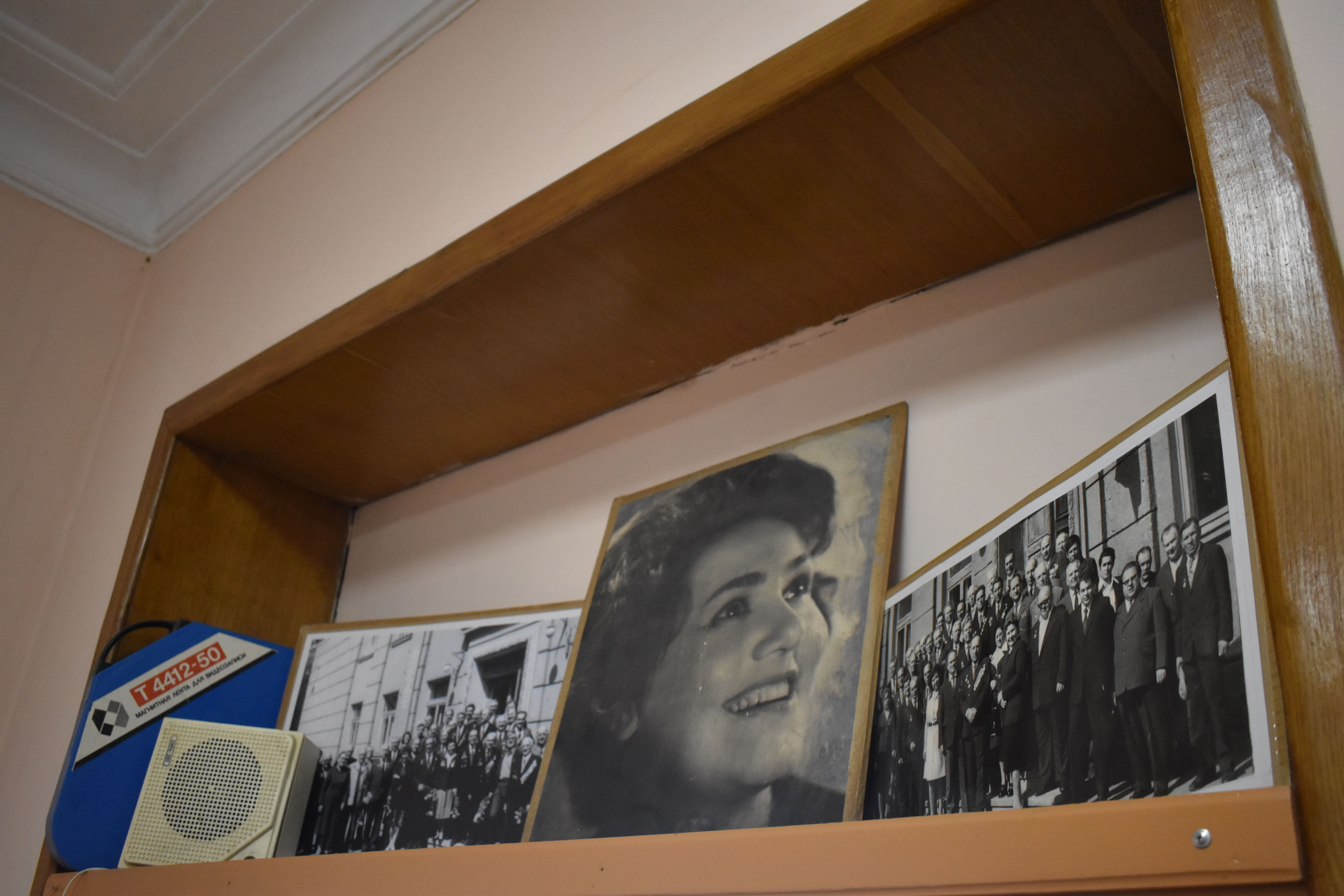 Вже знайомим шляхом повертаємося до приміщень «Суспільного». Олена проводить до ще одних старих дверей, за якими ми бачимо зачатки - окремі артефакти, елементи майбутнього музею: два роялі, монтажні столи, металеві диски з кіноплівками.