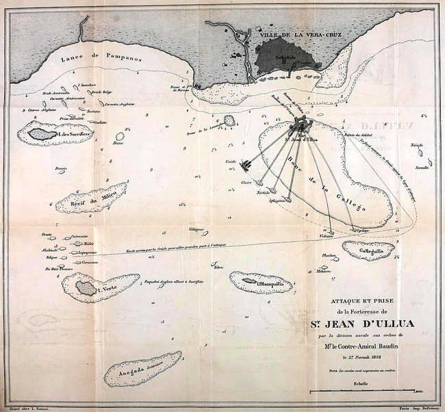 Позиції французьких кораблів на плані атаки Сан-Хуан-де-Улуа. Схема: Вікіпедія