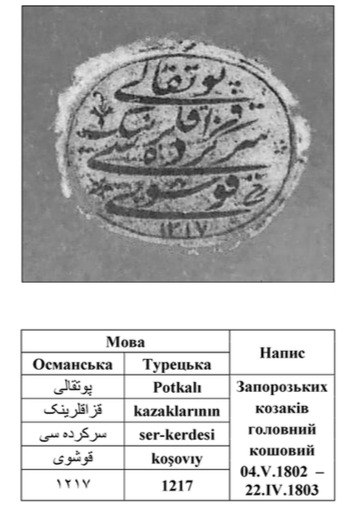 Наприкінці 90-х років XVІІІ ст. з’являється печатка задунайців. Ії поява безперечно засвідчує визначений статус козаків. Так, згаданий купець Євтіхій Кльонов у січні 1796 р. просив у отамана Якима Гардового “п’ять планкетів з військовою печаткою для проїзду за кордон козаків”. Печатка не мала зображень, а лише текст “Potkalı kazaklarının ser-kerdesi koşovıy. 1217” – “Поткальських козаків отаман кошовий. 1802/1803”.