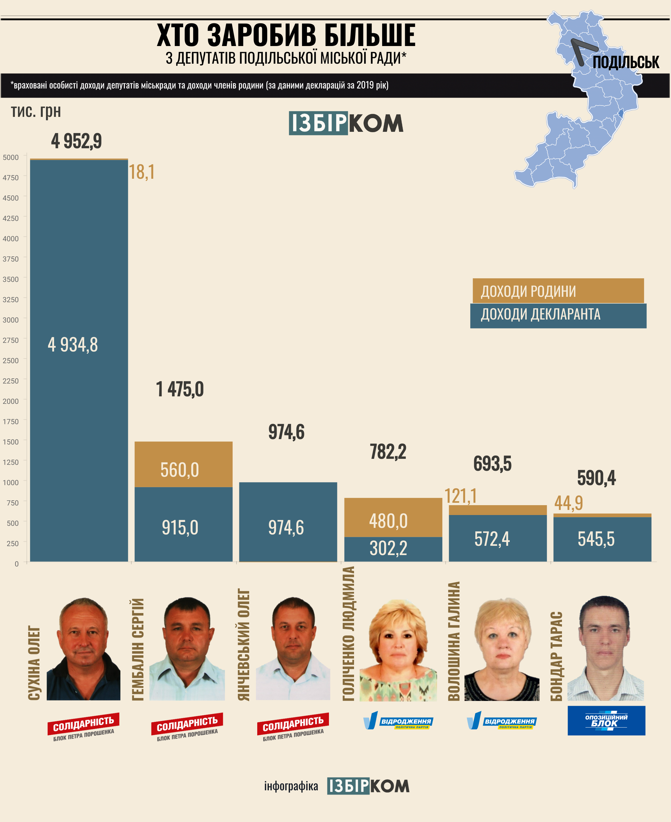 Власник найбільшого автопарку серед депутатів Подільської міської ради Олег Сухіна знов вирвався в лідери. За минулий рік, завдяки своїй підприємницькій діяльності, він заробив 4 мільйони 890 тисяч 436 гривень. Також депутат отримав 44 тисячі 400 гривень пенсії. Його родичі (брат, дружин та син) теж займаються підприємницькою діяльністю, але їх доходи в декларації не вказано. Брат депутата задекларував тільки свою пенсію, сума якої за рік трохи перевищила 18 тисяч гривень.