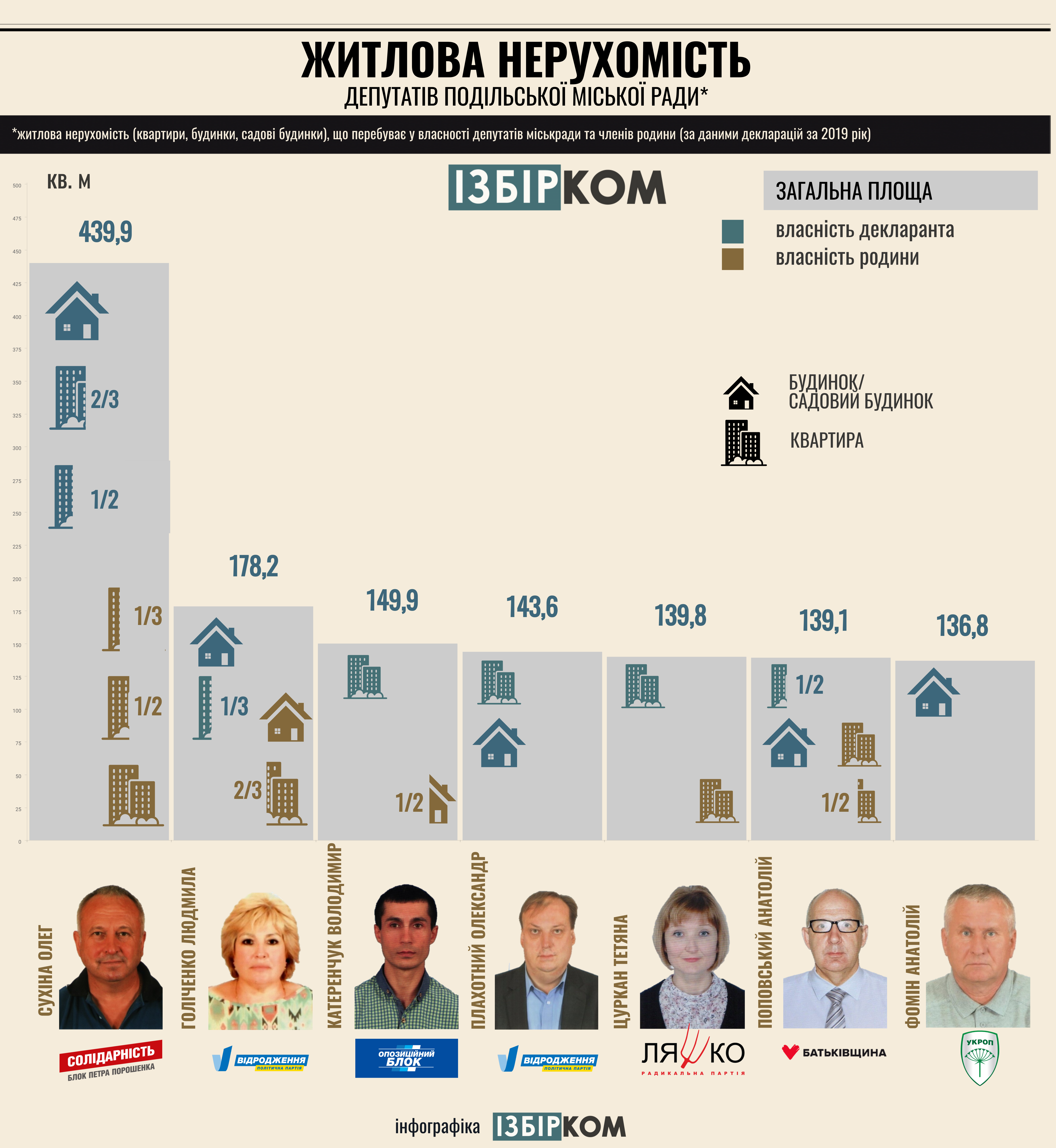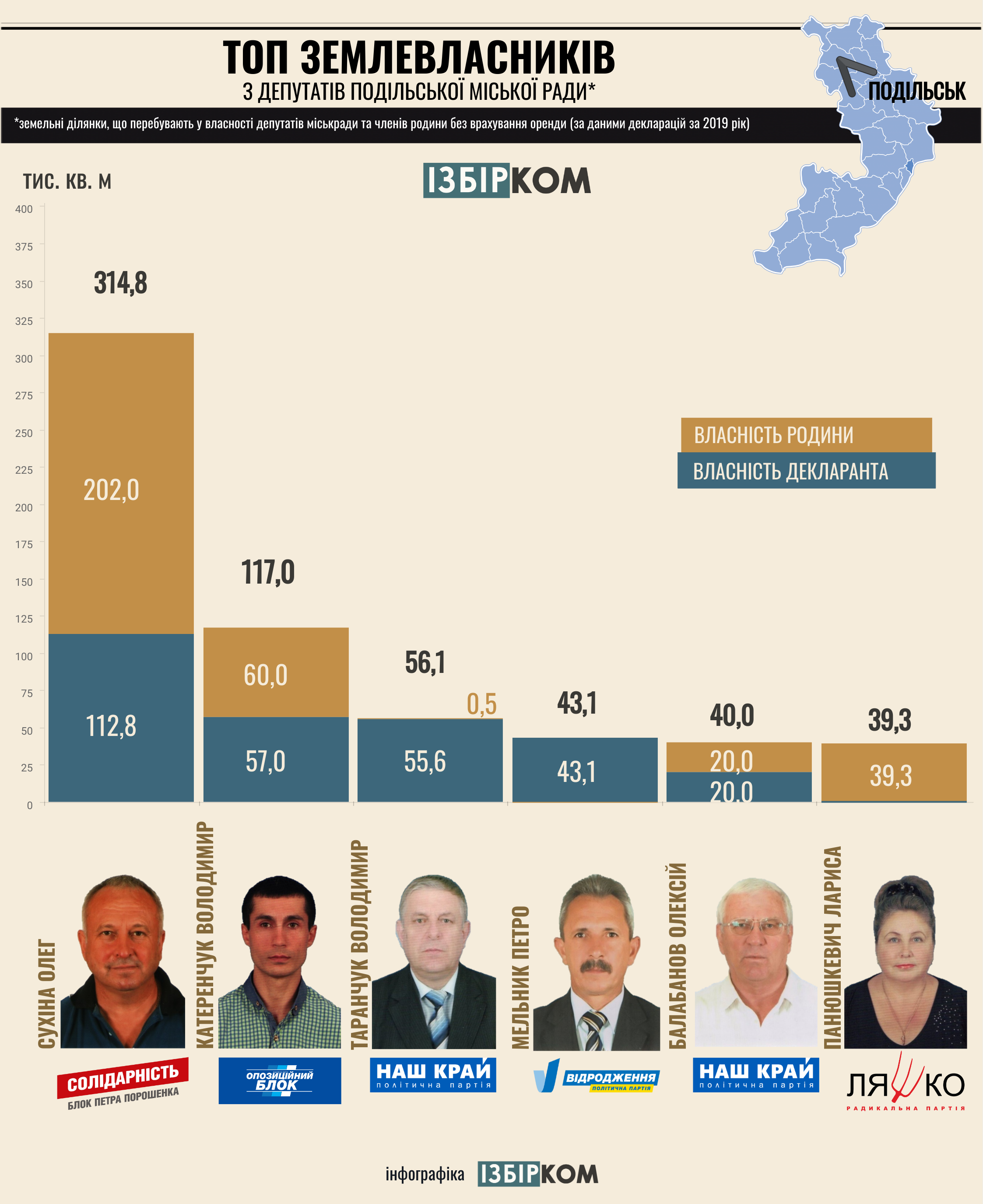 Землю задекларувала майже половина - 15 депутатів міськради. За кількістю земельних ділянок знову в лідерах підприємець Олег Сухіна. У його особистій власності понад 11 гектарів землі в селах Подільського району. Його родичі володіють ще понад 20 гектарами землі. Чотири земельні ділянки загальною площею понад 8 гектарів у дружини. Ще чотири земельні ділянки загальною плошею понад 7 гектарів у сина.