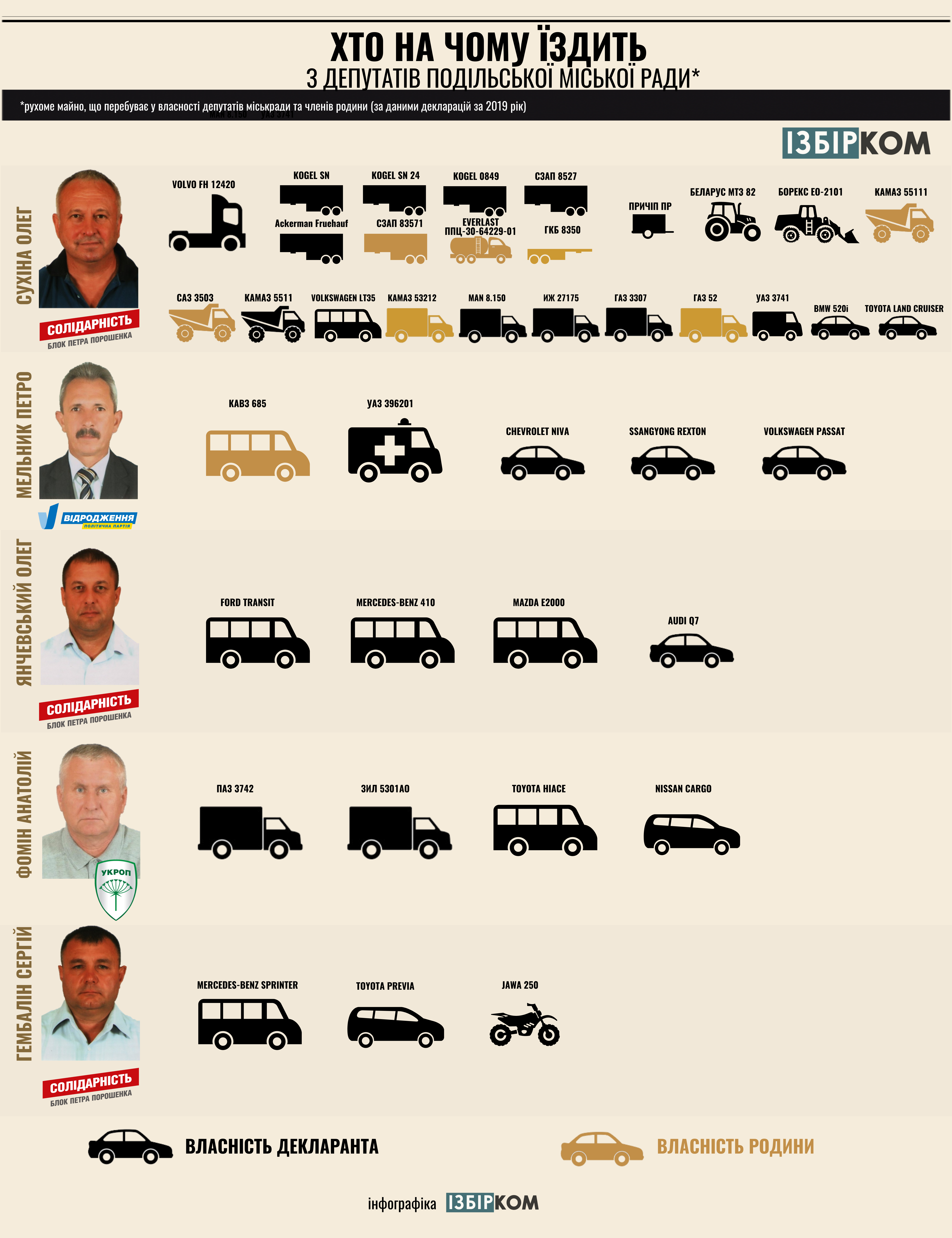 Петро Мельник з політичної партії «Відродження» має в активах чотири автомобілі. Все це легковий транспорт різних років випуску (від 1987 до 2008). У власності дружини депутата автобус КАВЗ 685 1984 року випуску. Олег Янчевський з БПП «Солідарність» задекларував чотири іномарки, наймолодша з яких 2013 року випуску, а найстарша – 2001. Анатолій Фомін з політичного об’єднання «Укроп» також має у своїй власності чотири транспортні засоби: три вантажні автомобілі та автобус. Сергій Гембалін з БПП «Солідарність» задекларував три транспортні засоби: вантажний «Мерседес» 2003 року, легковик «Toyota» та справжній раритет – мотоцикл «Ява» 1963 року випуску.