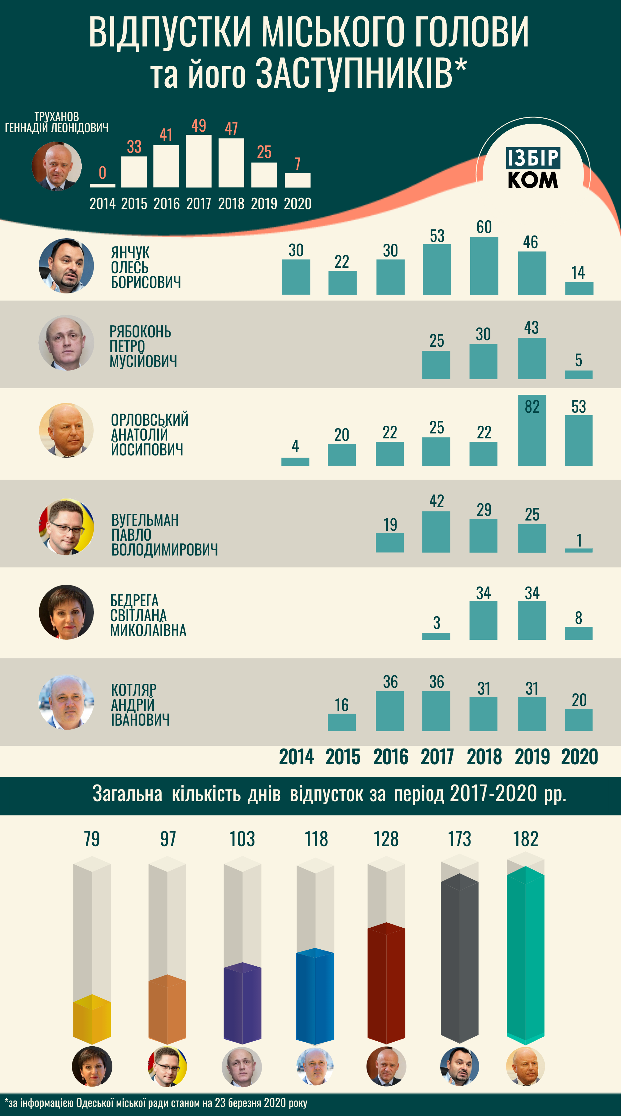 Міський голова Одеси Геннадій Труханов жодного разу за весь час своєї посади не брав відпустку у повному обсязі за один раз. Такої ж практики дотримуються і його заступники. І якщо про відпустки мера офіційний сайт муніципалітету регулярно інформує, оприлюднюючи розпорядження міського голови, то про відпустки його заступників інформації у відкритому доступі немає.