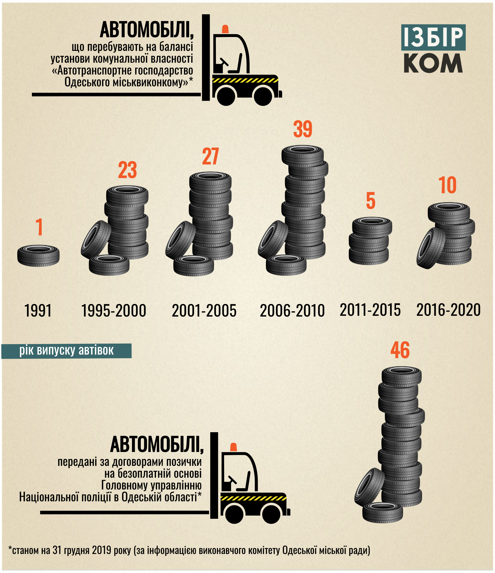 Із загальної кількості автомобілів, що перебувають на балансі автотранспортного господарства, 46 мерія передала за договорами позички на безоплатній основі Головному управлінню Нацполіції в Одеській області. Йдеться про 12 автомобілів «ВАЗ-21074», 2010 р. в.; стільки ж «ВАЗ-2107», 2006 р. в.; сім «ВАЗ-217030-110-01», 2008 р. в.; шість «ГАЗ-2752-414», 2006 р. в. Також мерія передала по одній автівці наступних марок: «ВАЗ-210430-20», 2007 р.в.; «ГАЗ-22171-540», 2008 р.в, «ВАЗ-21124», 2004 р.в. та Toyota Camry, 2004 р.в.