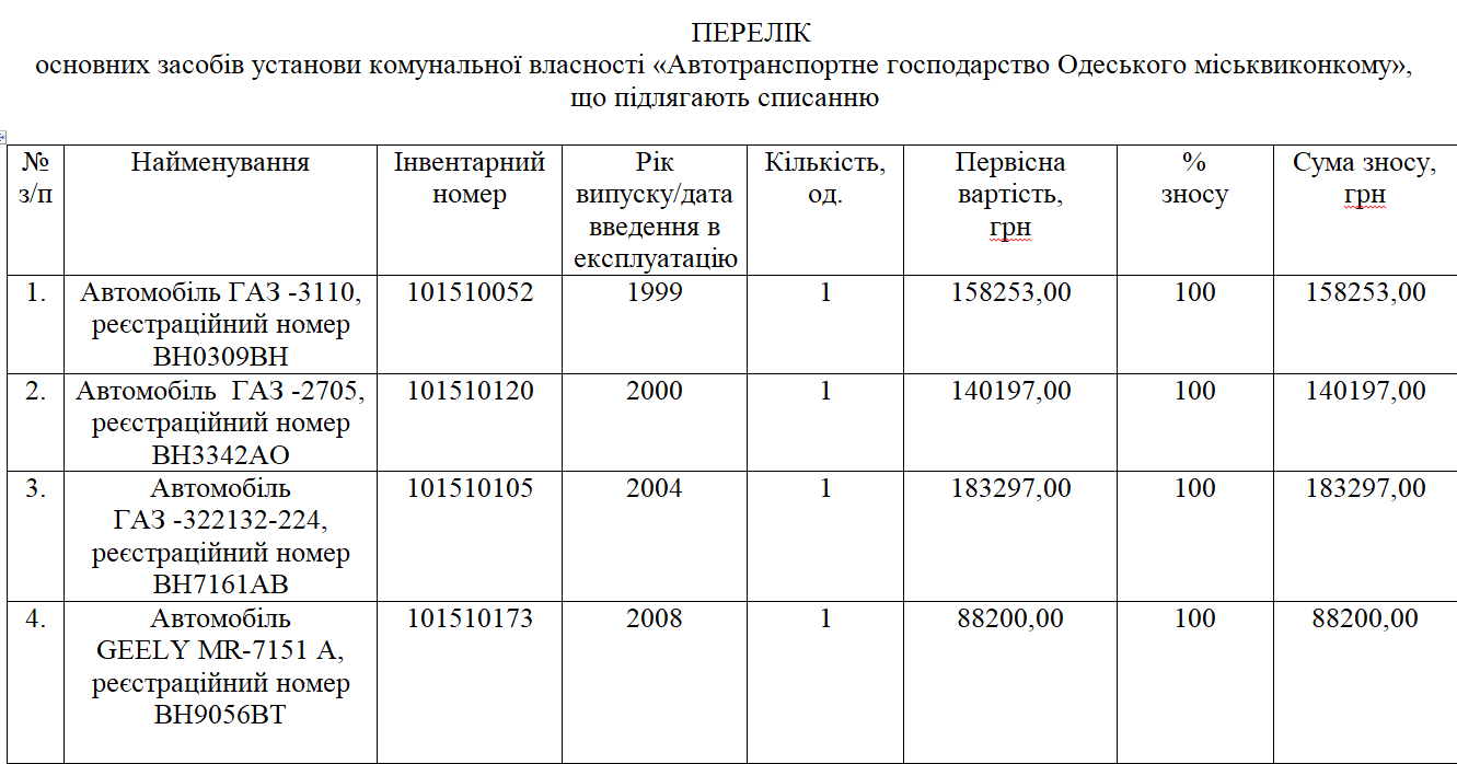 Нагадаємо, що у мерії дали дані станом на 31 грудня 2019 року. З того часу сталися певні зміни. Так, під час сесії Одеської міської ради, яка відбулася 6 лютого, з балансу установи були списані «основні засоби, непридатні для подальшого використання», серед них – чотири автівки. У додатку до рішення міськради йдеться про те, що автомобілі зносилися на 100 відсотків. Зокрема, депутати дали згоду на списання «ГАЗ-3110», 1999 року випуску, «ГАЗ-2705», 2000 року випуску, «ГАЗ-322132-224», 2004 року випуску, та GEELY MR-7151 A, 2008 року випуску.