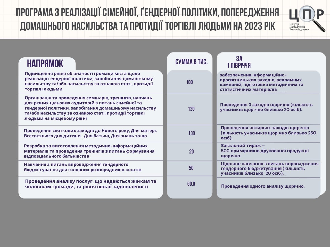 Чимало пунктів стосується виготовлення друкованих матеріалів та проведення методичних робіт, на що можна залучати міжнародну грантову допомогу. Проте ніякої інформації за жодним пунктом про таке залучення коштів немає. Вся програма використовує лише бюджетні кошти громади. Всього на цю програму у бюджеті воєнного року закладено 4 млн грн.