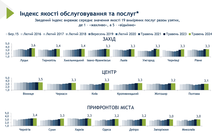 Показник Одеси 3,2 зведеного індексу якості обслуговування та послуг важко визнати провальним, загалом це відповідає загальноукраїнському рівню. Лідер Луцьк із коефіцієнтом 3,6, замикає таблицю Миколаїв із показником 3,0. Якщо розглядати окремі послуги, то ситуація виглядає значно гірше.