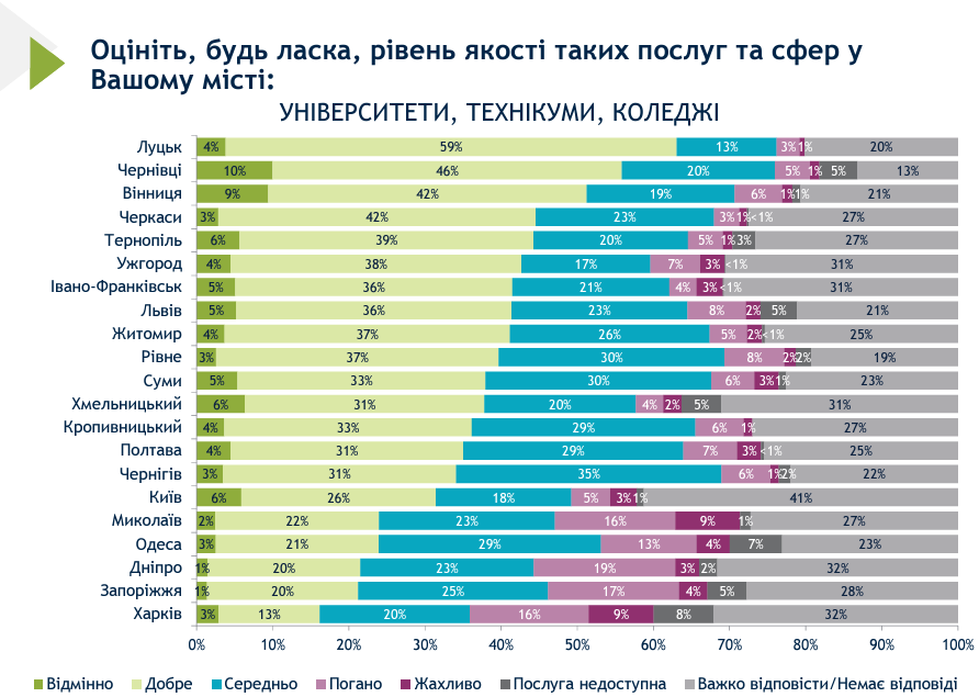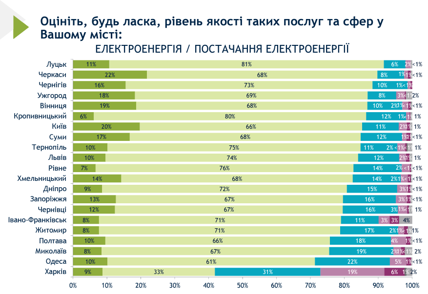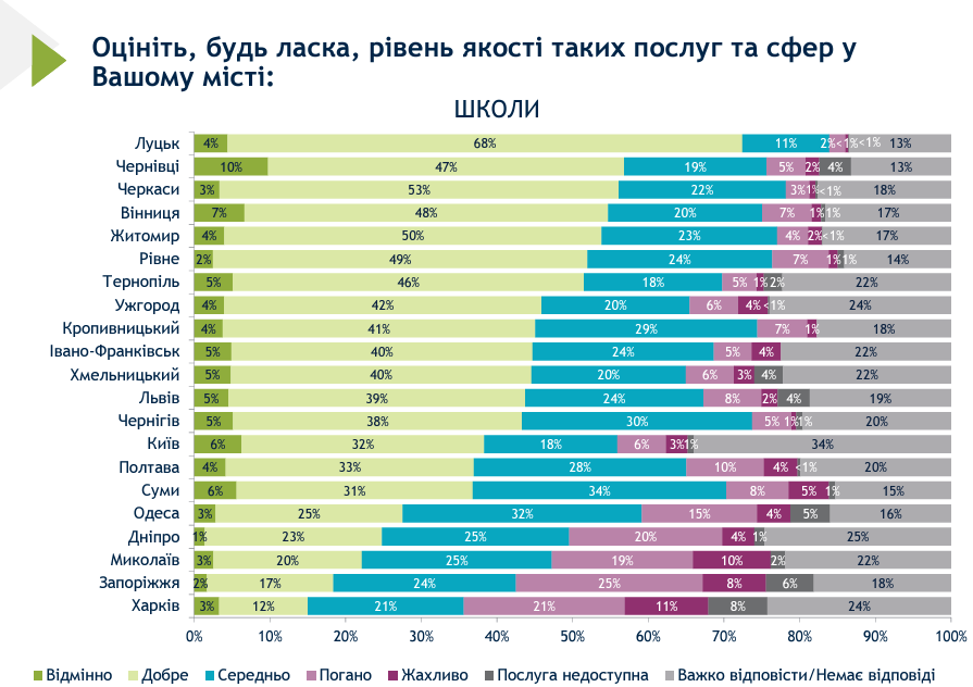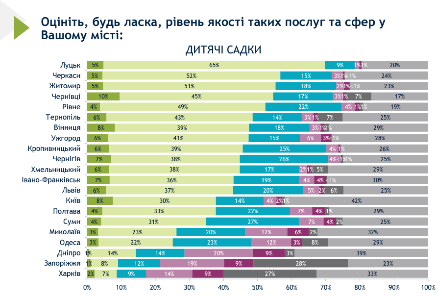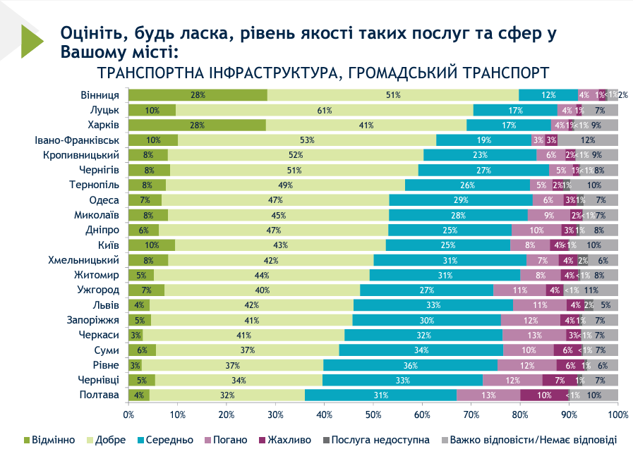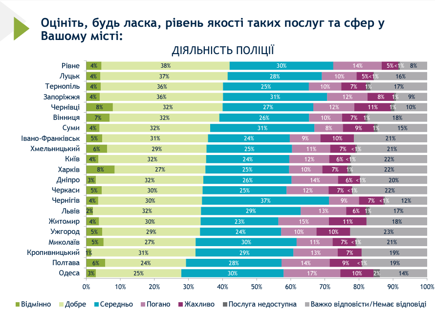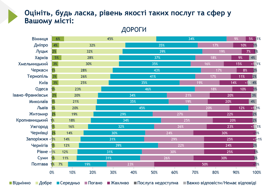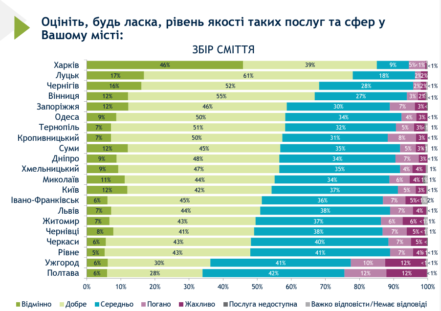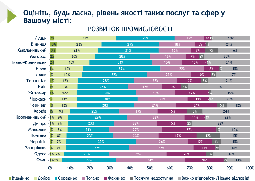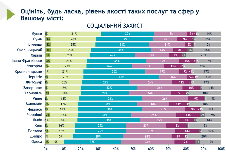 З 19 послуг, які взяли до уваги автори дослідження, лише по чотирьох Одеса опинилася в першій десятці: вивіз сміття - 6, транспортна інфраструктура - 8, дороги - 9 та водопостачання - 10 сходинка. Найгірше одесити оцінили поліцію та соціальний захист - останнє 21 місце. На передостанньому 20 місці Одеса з розвитку промисловості та електропостачанню. Пасе задніх Одеса й у сфері освіти.