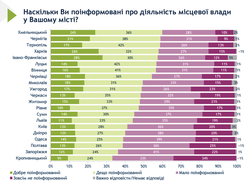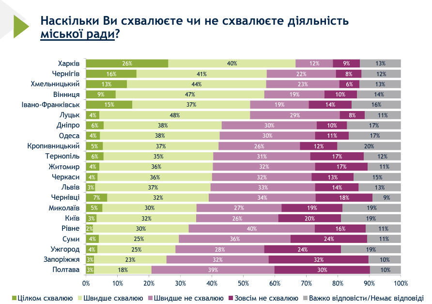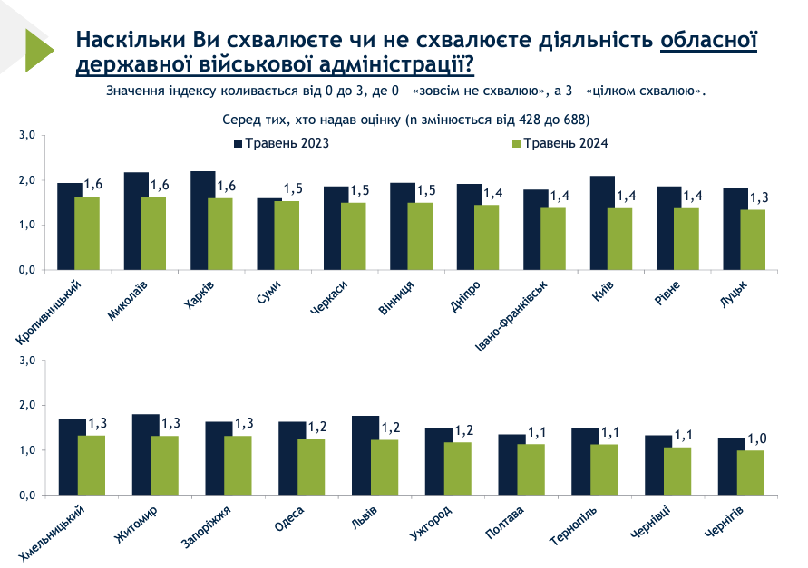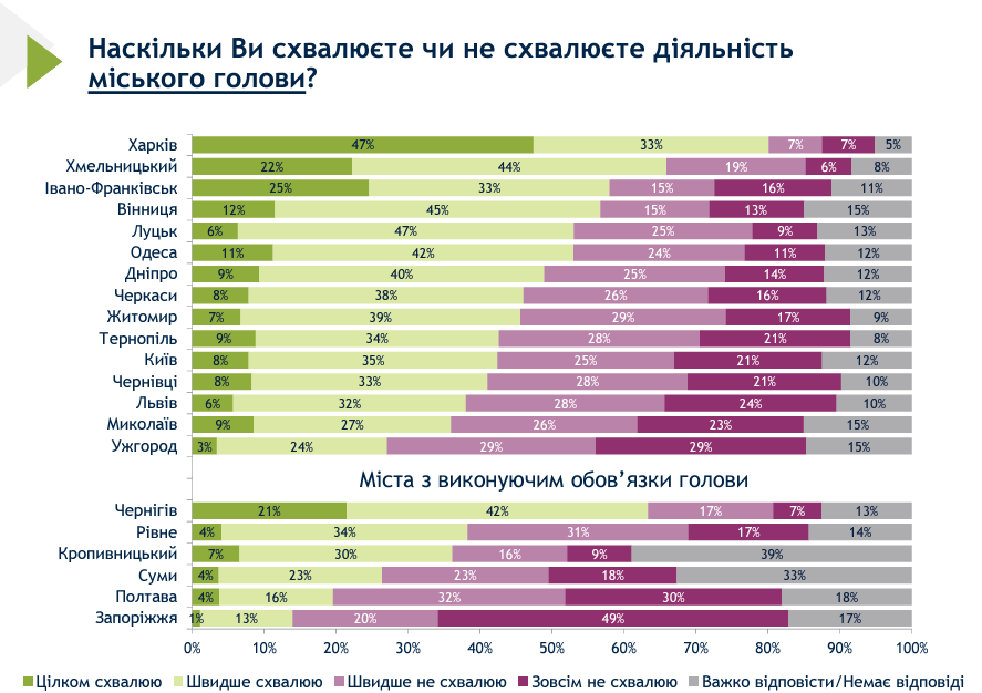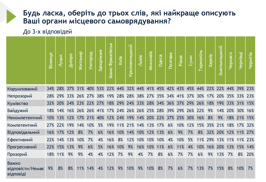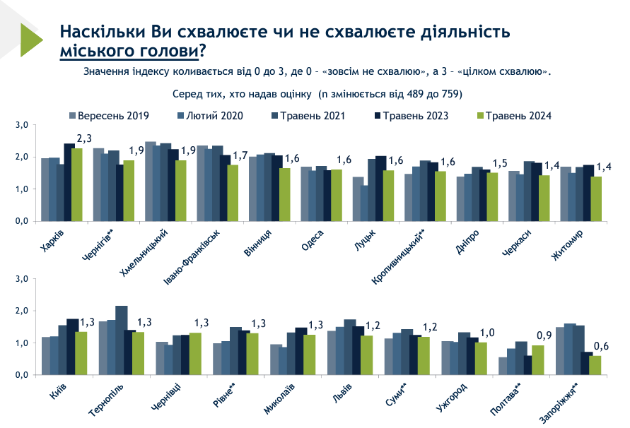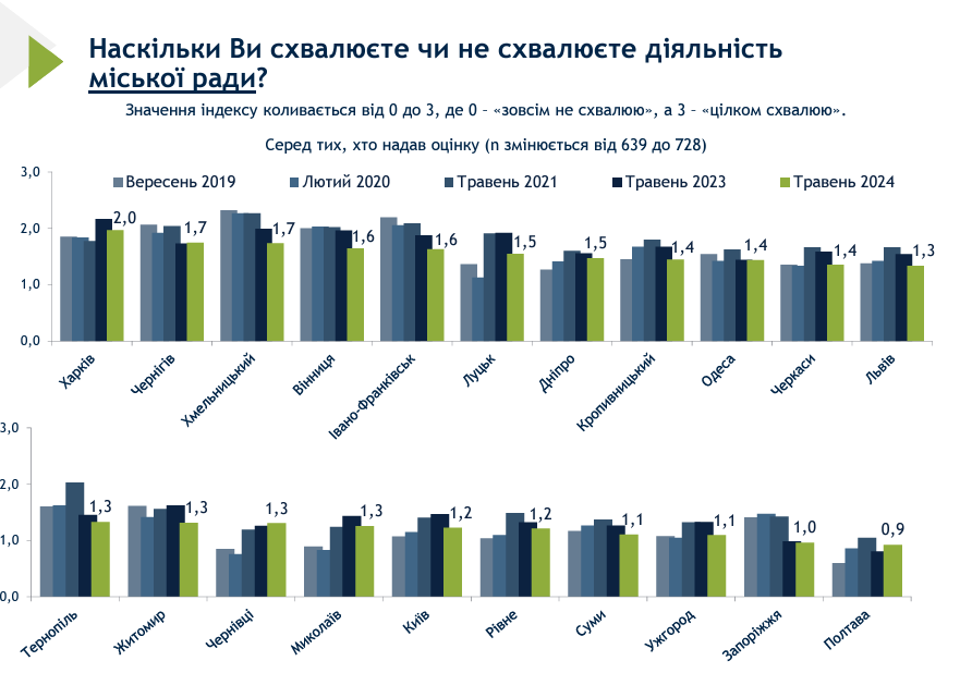 Стали відомі результати дев’ятого поглибленого дослідження у сфері місцевого самоврядування в Україні. Опитування проводилося Соціологічною групою "Рейтинг" на замовлення Центру аналізу та соціологічних досліджень Міжнародного республіканського інституту у 21 місті України (Київ та усі обласні центри, де безпекова ситуація дозволяла провести дослідження) з 13 квітня по 14 травня 2024 року за допомогою face-to-face інтерв'ю вдома у респондентів.