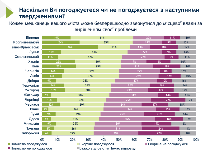 Якщо порівнювати ставлення одеситів до міського голови, міської ради та ОВА, то найкращі показники у Геннадія Труханова. Він має шосте місце в табличці з показником 11% повністю схоплювати діяльність мера і ще 42% швидше схвалювали його діяльність. У міської ради ці показники дещо нижчі - 8 місце (4 та 38 відсотків відповідно), позиції обласної ОВА гірші (7 та 24 відсотки), у результаті лише 13 місце.
