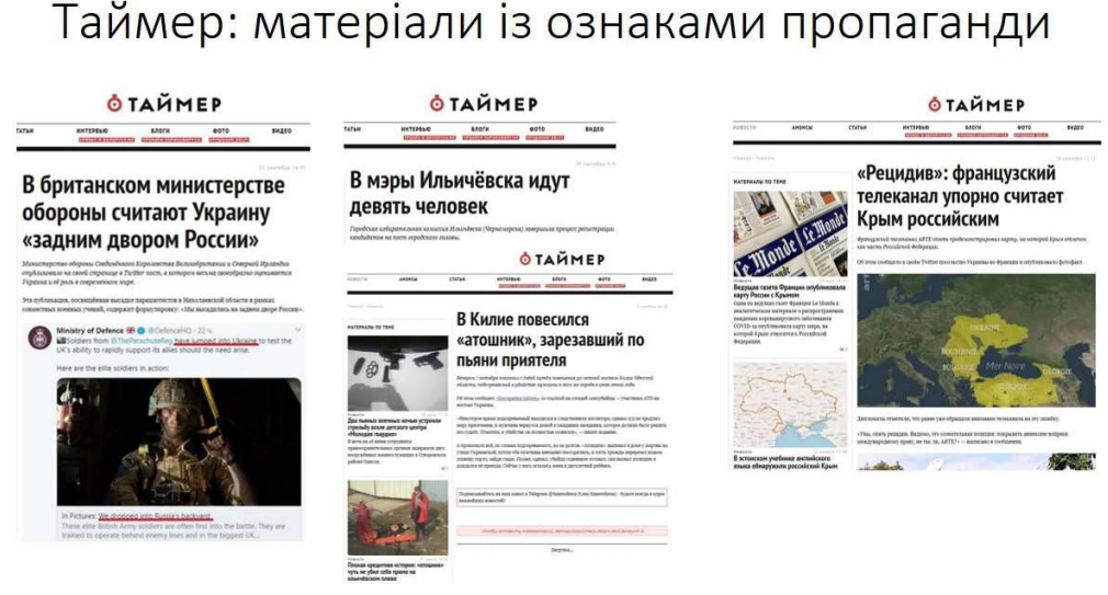 Основним джерелом проросійських пропагандистських меседжів в одеському регіоні є сайт «Таймер», який відстоює подібну політику тривалий час. Тут експерти знаходять мову ворожнечі, умисну дезінформацію, дискредитацію української державності та тенденційний підбір новин.