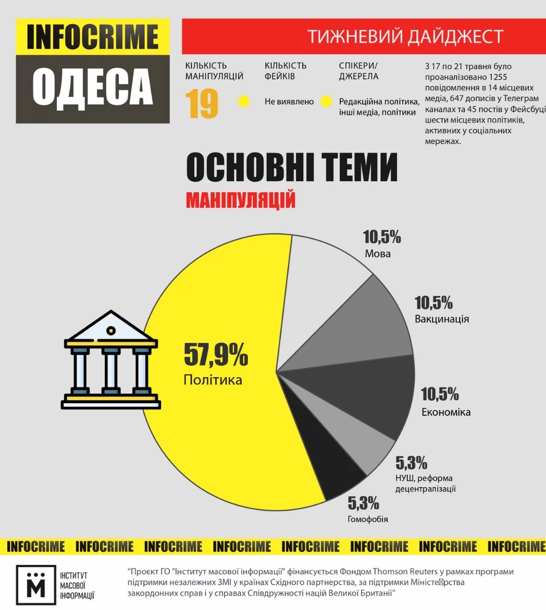 Команда проєкту Іnfocrime Одеса презентувала щотижневого моніторингу одеського інформаційного простору, основним висновком якого вважає те, що навіть у міжвиборчий період одеські політики та провідні регіональні ЗМІ маніпулюють переважно на політичні теми.