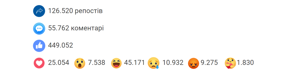 - 20 тис. 889 лайки, що складає 23% від лайків усіх пропагандистських постів.