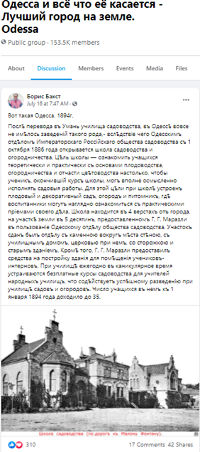 Більш ніж половина дописів цієї категорії містить фотоілюстрації Одеси періоду кінця XIX ст. - кінця XX ст. Здебільшого автори дописів поширюють інформацію про видатних одеських діячів культури та певні історичні дані про вулиці та місця Одеси. Усі дописи пронизані ностальгією та смутком за минулими часами. Популярними також стали сімейні архівні фото одеситів.