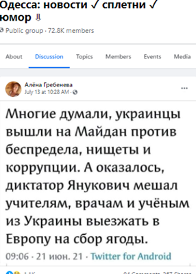 3) Наявність у тексті ностальгії за часами СРСР та Російської імперії. Твердження про єдність українського та російського народів тощо. Подання новин РФ як власне вітчизняних новин – 167 дописів.