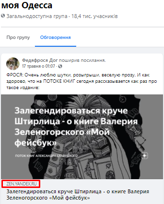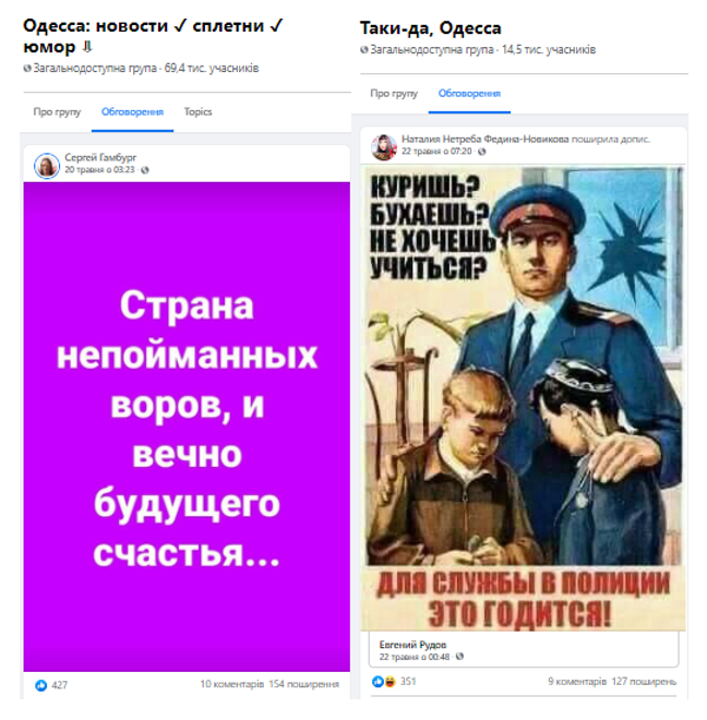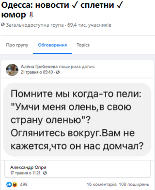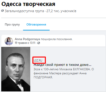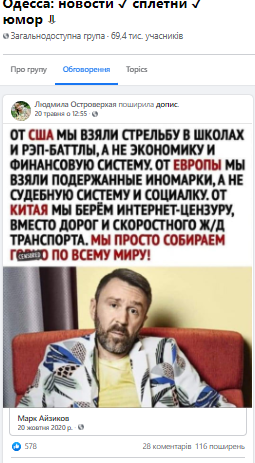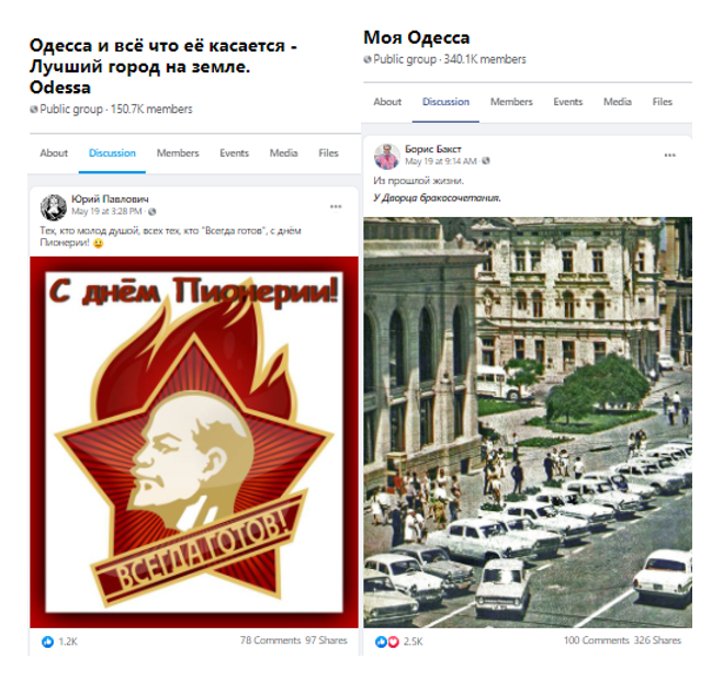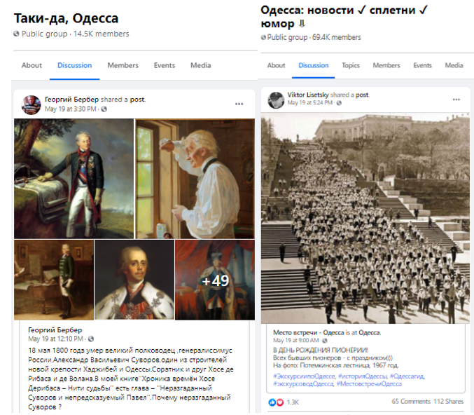 Абсолютна більшість дописів – розважальний контент, від гороскопів до підбірок гумористичних фото тварин, проте увесь цей масив контенту належить або російським FB групам, або містить посилання на російські сайти. Варто додати, що у групах активно поширюють матеріали про російських діячів культури. Цього тижня було поширено 2 дописи про російського письменника М. Булгакова, 6 дописів про смерть радянської актриси Тетяни Проценко, 3 матеріали про радянського вченого-фізика Андрія Сахарова та ще 7 матеріалів про діячів культури радянської доби, які народились в Одесі.