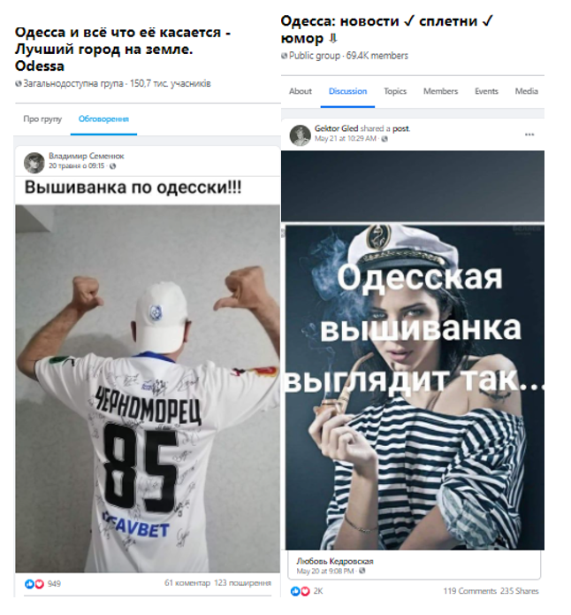 20 травня в Україні святкували День вишиванки. У одеських пабліках одразу з’явились дописи з "одеськими вишиванками" -- у вигляді футболки "Чорноморця" та тельняшки. Подібний прийом фіксації територіальної та ментальної окремішності одеситів повторюється вже кілька років поспіль "під дату". Також було зафіксовано 2 дописи, що стверджували про існування "одеської ідентичності".