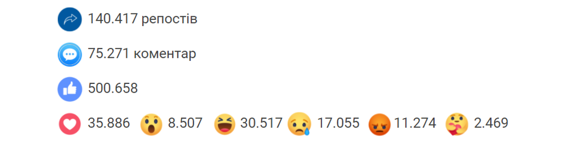 - 54 тис. 283 лайки, що складає 9% від усіх лайків тижня, або 83% від лайків усіх пропагандистських постів.
