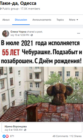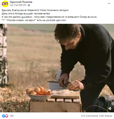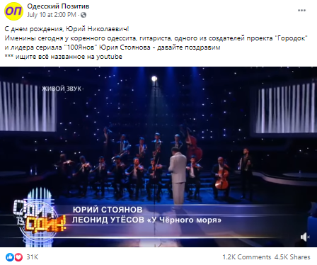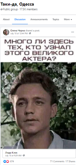 Одеські пабліки опублікували 27 дописів-привітань з днем народження російських акторів Лії Ахеджакової та Юрія Стоянова, підкріплених фрагментами із фільмів та телепрограм. Одеські пабліки майже у кожному дописі вказували місце народження цих акторів, називаючи їх "нашими" або "багато в чому нашими". Дійсно, Лія Ахеджакова народилась у м. Дніпро, а Юрій Стоянов - в Одесі. Попри це, актори являються все ж російськими акторами та, за всієї поваги до проукраїнської позиції Лії Ахеджакової, згадувані пости містять властиву таким дописам "неточність" щодо прив’язки цих акторів до "наших". Крім того, Юрій Стоянов у 2018 році потрапив до бази "Миротворця", оскільки брав участь в зйомках фільму на території анексованого Криму.