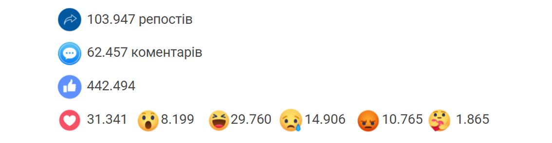 - 60 тис. 902 лайки, що складає 11% від усіх лайків тижня, або 44% від лайків усіх пропагандистських постів.