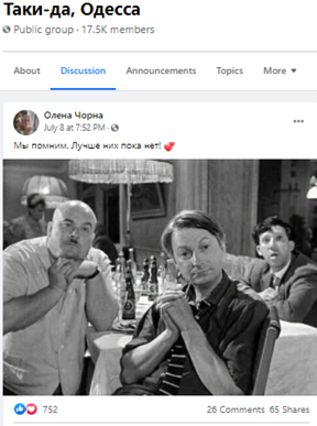 2) Наявність у тексті ностальгії за часами СРСР та Російської імперії. Твердження про єдність українського та російського народів тощо. Подання новин РФ як власне вітчизняних новин – 157 дописів.