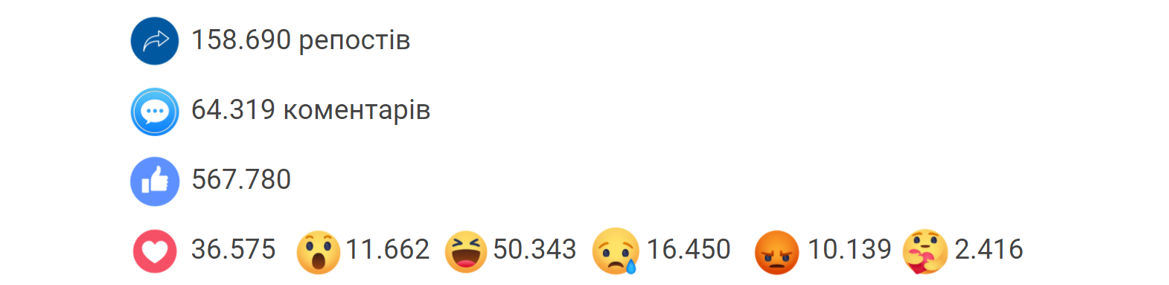 - 61 тис. 782 лайки, що складає 9% від усіх лайків тижня, або 72% від лайків усіх пропагандистських постів.