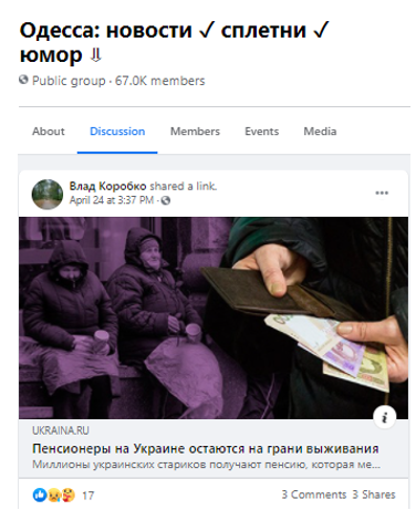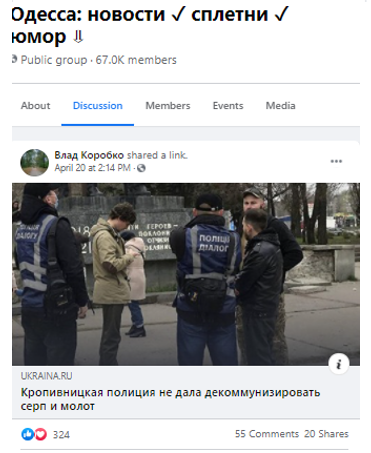 Варто додати, що 40 дописів цієї категорії (або 37% матеріалів) були опубліковані у групі "Одесса: новости, сплетни, юмор". Серед цих матеріалів дописи з посиланнями на strana.ua (11 постів), sharij.net (8 постів), yandex.ru (5 постів), ukraina.ru (3 пости), дописи з іншими посиланням на web-ресурси з доменом .ru – 13 дописів.