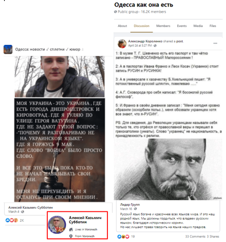 Таким образом, любая неграмотная речь на любом языке мира, может считаться украинским языком". Зміст другого допису інакший. Автор переконує, що усі видатні українські письменники насправді росіяни і існує лише російська мова, яку притискають. Автор прямо каже, що української нації не існує і приводить абсурдний аргумент, що буцімто слово "українець" не національність, а приналежність до релігії.