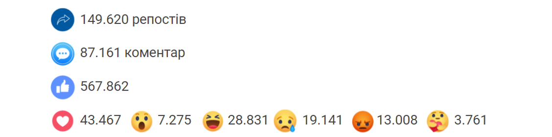 - 80 тис. 322 лайки, що складає 11,8% від усіх лайків тижня.