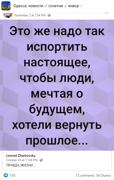 п.5 Наявність у тексті ностальгії за часами СРСР та Російської імперії. Твердження про єдність українського та російського народів тощо. Подання новин РФ як власне вітчизняних новин – 123 дописи.