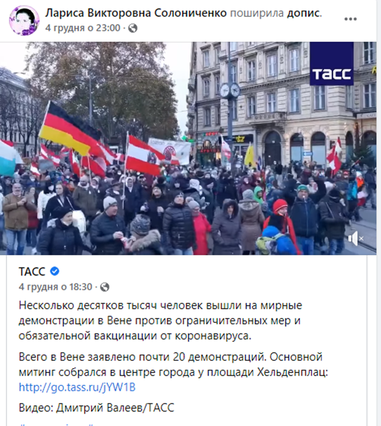 Зокрема цікавим з точки зору аналізу пропаганди є повідомлення щодо протестів у Відні проти обов'язкової вакцинації, що містить відео від ТАСС РФ, в якому перебільшується обсяг протестів та власне сама проблема вакцинації: