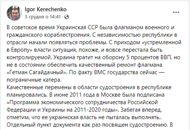 Наявність у тексті ностальгії за часами СРСР та Російської імперії. Твердження про єдність українського та російського народів тощо. Подання новин РФ як власне вітчизняних новин