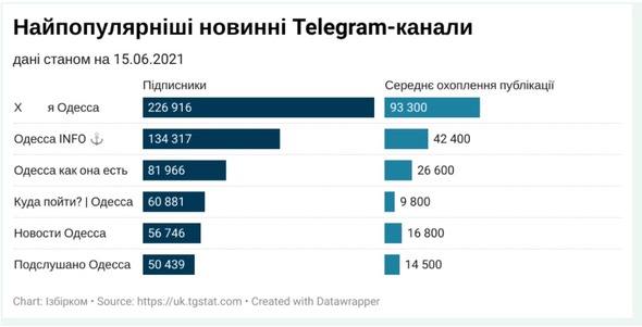 Якщо аналізувати дані tgstat.com в Одесі, то до найпопулярніших новинних каналів належать «Х...я Одесса», «Одесса INFO», «Одесса как она есть», «Куда пойти? | Одесса», «Новости Одесса», «Подслушано Одесса», частина з яких позиціонують себе як ті, що публікують треш та гарячі новини. Однією з характеристик таких новинних ресурсів є те, що вони не дотримуються стандартів журналістики й поширюють емоційні та сенсаційні новини. Таким чином, подібні канали в середньому мають в 10 разів більшу кількість підписників.
