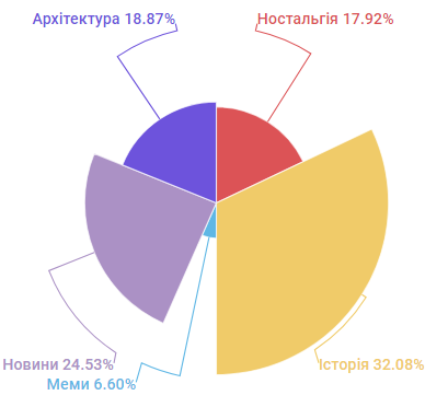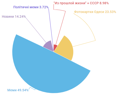 Найбільша кількість постів (34 дописів) стосувались історичної теми (відкриття в Одесі першого в СРСР музею особистих колекцій, біографії одеських видатних діячів культури, які народились за часів Союзу, історичні події Голокосту та інше).