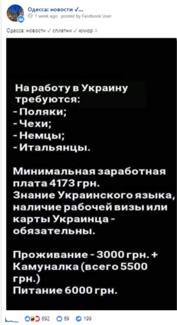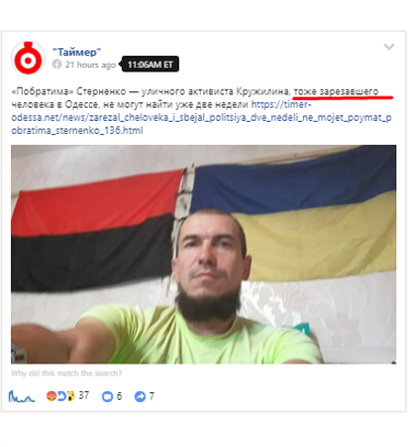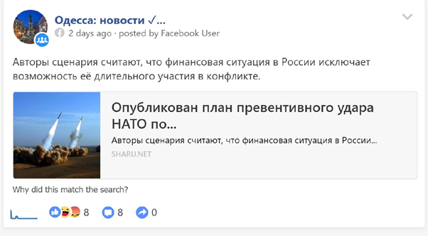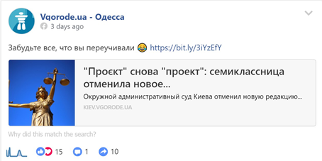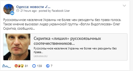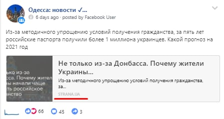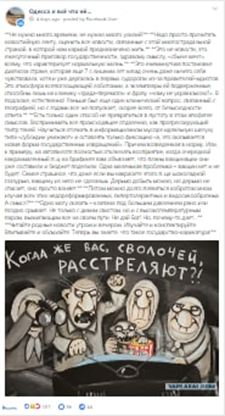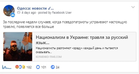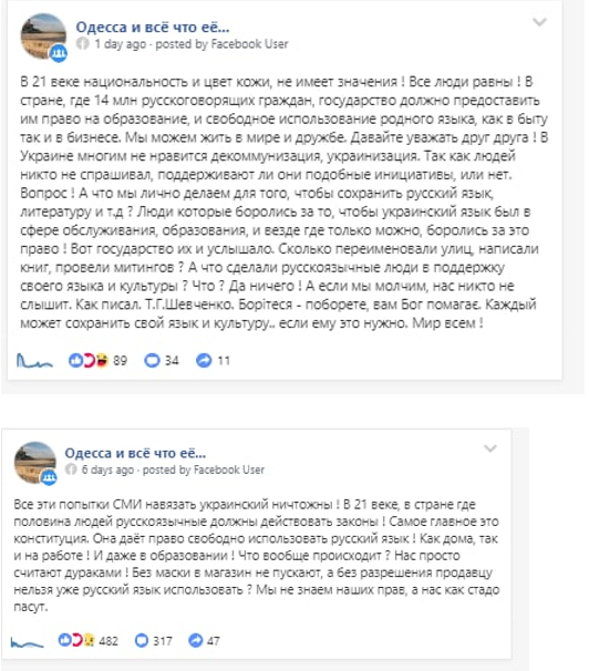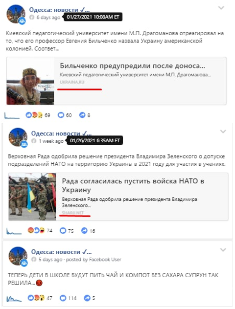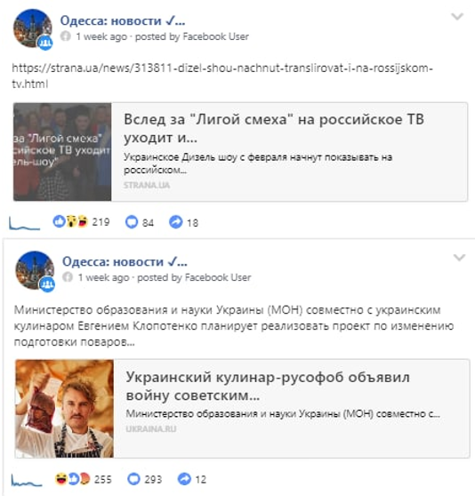 Протягом тижня паблік «Одесса: новости, сплетни, юмор» систематично поширював новини з проросійських ресурсів, таких як Украина.ру (мультимедійне видання, що входить до складу міжнародної медіагрупи «Росія сьогодні»), Шарий.net (новинний сайт А. Шарія - проросійського журналіста), Страна.ua (новинний сайт, що поширює антизахідні та проросійські меседжі), Klymenko Time (медіа, що контролює Олександр Клименко, ексміністр доходів і зборів України із «сім’ї Януковичів»).