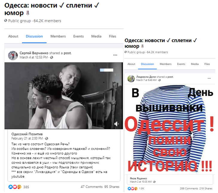 Минулого тижня у групі "Моя Одесса" був зафіксований допис у якому розповідається про існування окремої "одеської мови" та було наведено фрагмент з російського багатосерійного фільму "Ліквідація". Цього тижня історія повторилась і, знову ж таки, автори матеріалу посилаються на російську інтерпретацію одеситів. Спершу допис був поширений 21 лютого, але це не завадило його актуалізувати через тиждень.