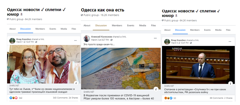 Людина, яка поширила цей пост у групу, також пропонує групі новини з медіа Шарія. Взагалі, сторінка цієї людина схожа на типову сторінку бота: відсутня будь-яка особиста інформація, лише декілька поширених абстрактних фото, відсутні друзі, на сторінці лише один допис про красиві місця Байкалу.