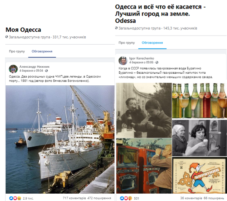 Основна маса матеріалів – фотоілюстрації радянської Одеси або ностальгія за дитинством. Варто додати, що активного поширення знаходять фрагменти радянських фільмів, які пов’язані з Одесою ("Золотой теленок", "Дванадцять стульев", "Операция "Ы" и другие приключения Шурика").