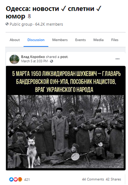 5 березня був поширений пост з суто російською риторикою. Тема героїв України, так само як і тема української мови, найкраще резонують у медіа площині та розколює суспільство. До речі, автору ілюстрації, було абсолютно байдуже є Роман Шухевич на фото чи ні, головне охрестити ворогом народу. На фото Спецгрупа УМГБ у Тернопільській області, що діяла під виглядом повстанців УПА.
