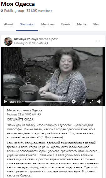 Крім того, у дописі міститься фрагмент з російського багатосерійного фільму "Ліквідація". Головний сюжет фільму полягає у боротьбі радянської влади проти бандформувань в Одесі після закінчення другої світової війни. У вміщеному фрагменті фільму одеситів зображують, вірогідно, стереотипними, з точки зору російської уяви, євреями: малограмотними, жадібними та хитрими. Водночас є симптоматичною є спроба авторів допису спиратись на художній фільм як на ілюстрацію окремішності "одеської мови".