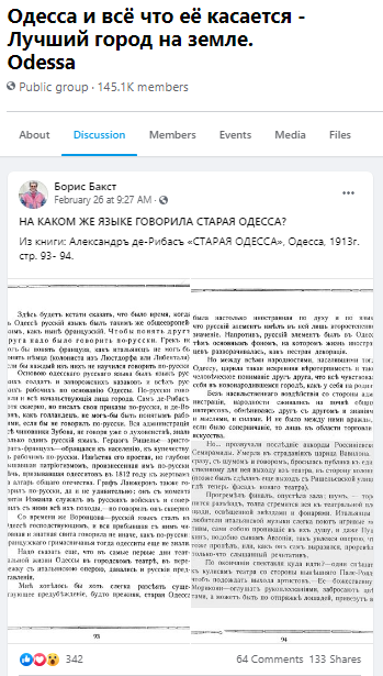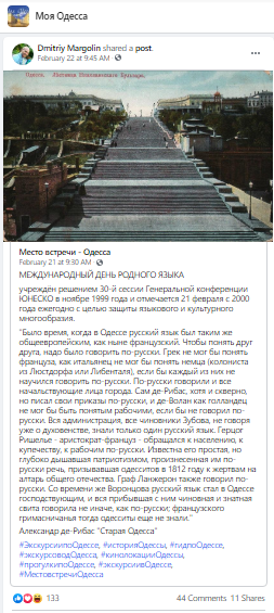 Окремо варто додати, що до Міжнародного дня рідної мови було опубліковано ще 3 дописи, у яких рідною мовою вважалась російська. Автори матеріалів цитували книгу Олександра Дерибаса "Старая Одесса: исторические очерки и воспоминания". Автори наголошують, що мова Одеси - російська і так було завжди.
