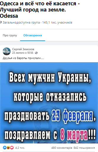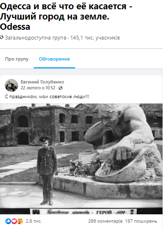 Одеські пабліки поширювали дописи-вітання, що апелювали до категорій радянської ідеології. Так, дописи містили словосполучення "мої радянські люди", "радянська армія", "радянська перемога", та "радянське минуле".