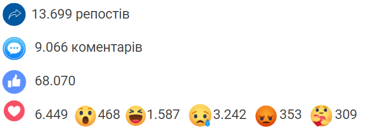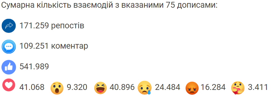 - 68 тисяч 70 лайків, що складає 12,5% від усіх лайків тижня, або 92,6% від лайків усіх пропагандистських постів.