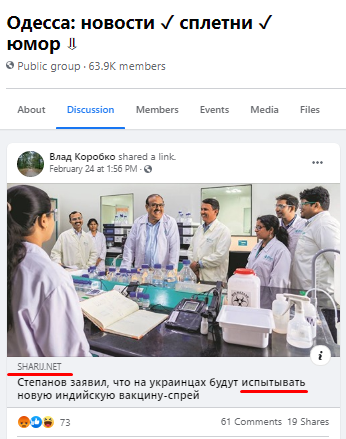 Такі медіа, як sharij.net та strana.ua найбільше роздмухують паніку на темі вакцинації українців. Показовим є допис у пабліку "Одесса: новости, сплетни, юмор" (Скрін додано нижче). Зверніть увагу на підібране зображення. Мета: викликати підсвідому емоцію знущання. Мовляв, подивіться, ці лікарі насміхаються, хочуть на нас випробувати вакцину. До речі, заголовок також красномовний. Вжите слово "випробувати" лише підсилює враження від зображення та викликає асоціацію: "випробовування - спочатку медичні вироби випробовують на тваринах - прирівняння українців до тварин".