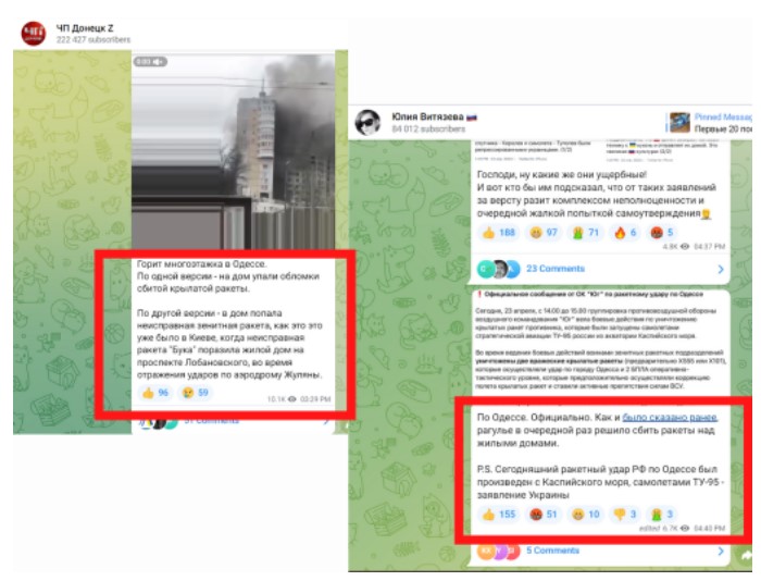 А щодо «великодніх ракет», які прилетіли в Одесу, то російські телеграм-канали спочатку бадьоро писали, що «ракети досягли своєї мети» – об’єктів військової інфраструктури.
