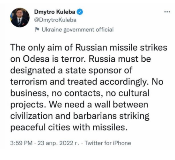 Голова МЗС України Дмитро Кулеба заявив, що єдина мета російських ракетних ударів по Одесі 23 квітня – терор. Також обстріл російськими військами міста узгоджується із заявою російських окупантів про намір прокласти коридор до Придністров’я (так званої «ПМР»).